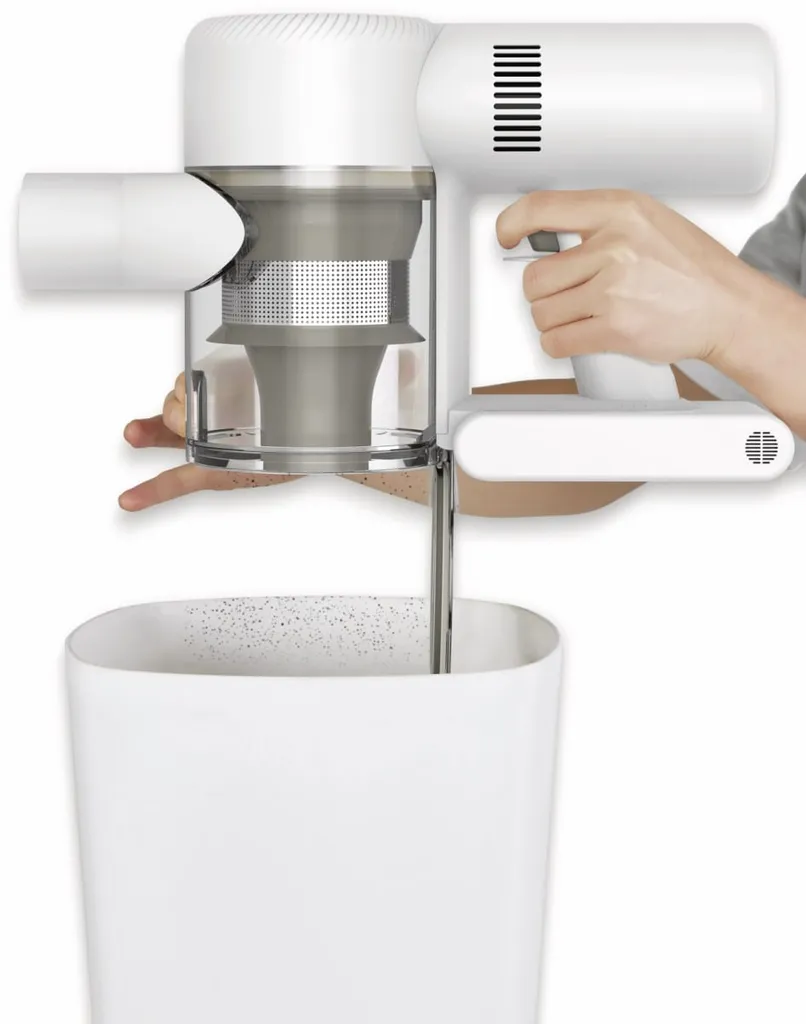 Das Entleeren des Staubbehälters ist leicht und hygienisch. Mit einem Knopfdruck kann der Behälter entleert werden, ohne mit dem Inhalt in Kontakt zu kommen.