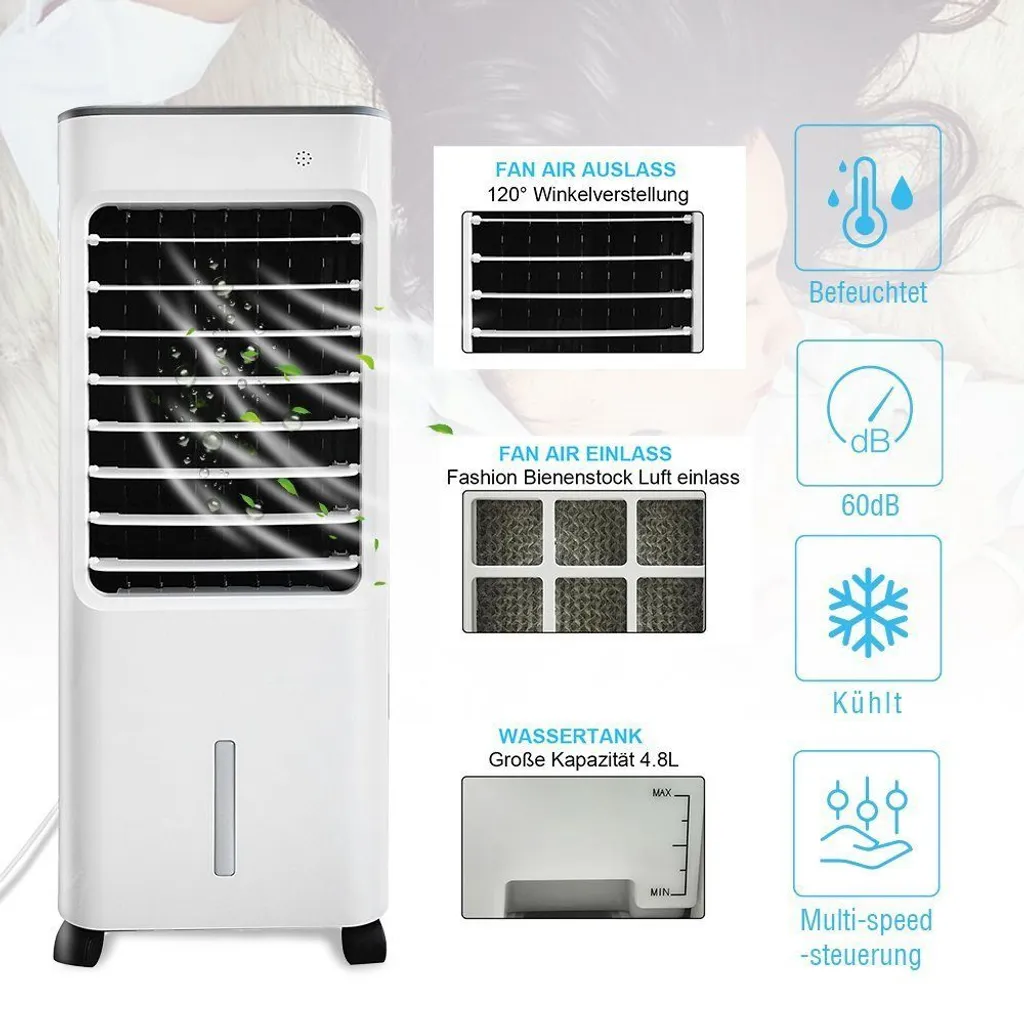 Luftkühler mit 4,8L Großer Wassertank: füllen Sie einfach den 4,8L Tank mit Wasser und Eiskristallen (inkl.), liefern Sie den Wind in einem Weitwinkel von 120 ° Winkel ein.Sparen Sie Energie und Geld.