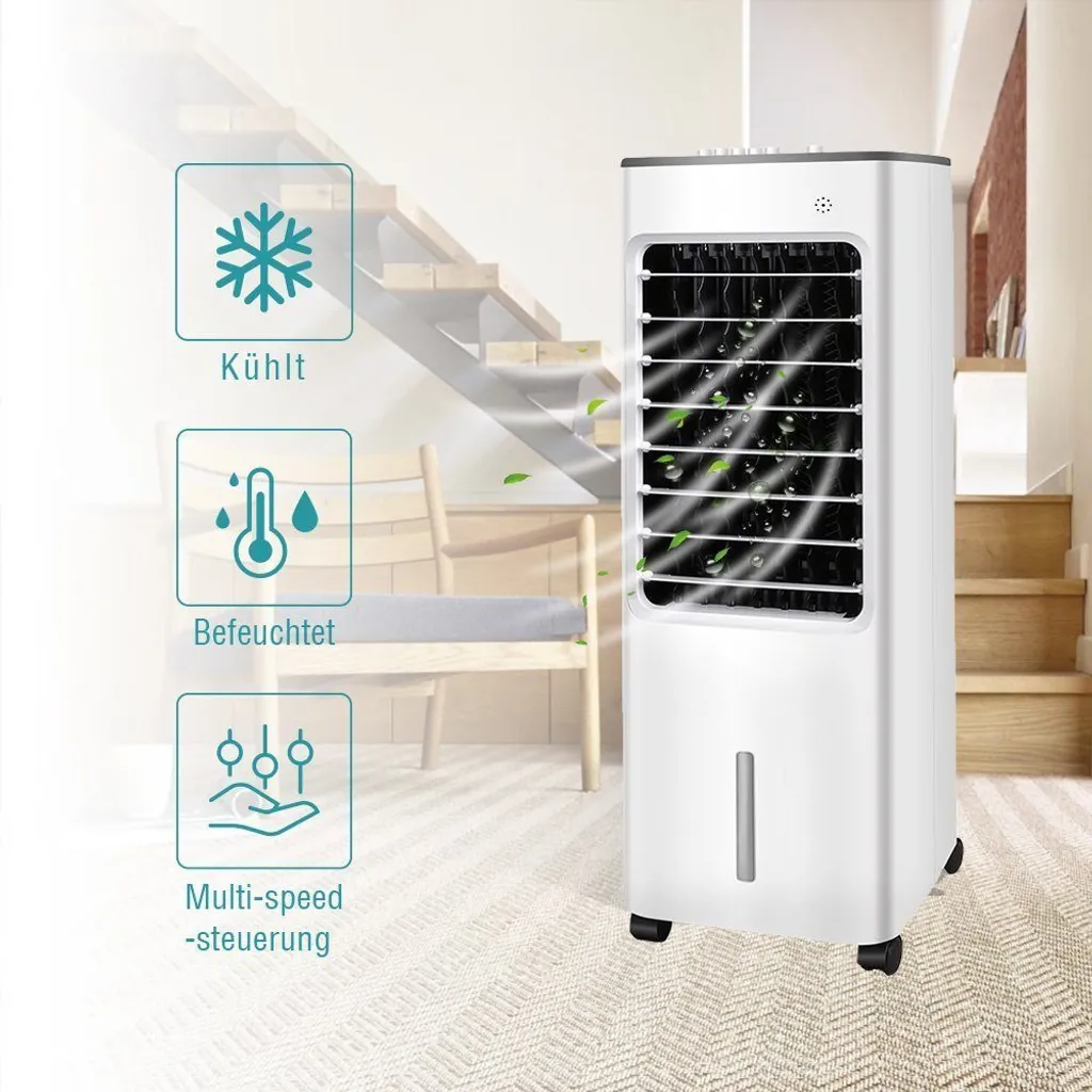 3 in 1 Funktion– Luftkühler, Luftbefeuchtung und Ventilator mit 3 Geschwindigkeitsstufen 4.5 Liter Wassertank. 55 dB Rauschen, Sie können in Ruhe die kühler Luft genißen.