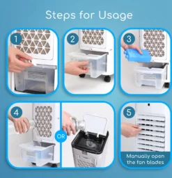 - Wasserkühlsystem sorgt für kühlen Wind, ausgestattet mit einem 3,5-Liter-Wassertank mit großer Kapazität und 2 en Eisboxen, kann der Verdunstungskühler-Ventilator lange Zeit weiter kühlen. Schützen Sie sich vor der Sommerhitze und eignet sich perfekt zum Kühlen mittelgroßer Räume in Ihrem Zuhause oder Büro.