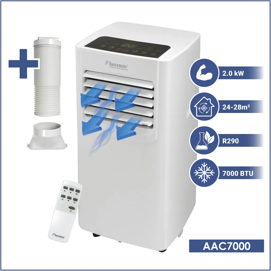 - Lieferumfang: 1 Bestron Mobile Klimaanlage, Abluftschlauch, Luftfilter, Fernbedienung, Cool & Clean, Leistung: 792 Watt, 220-240V 50Hz, Maße: 37,7 x 34,7 x 85,2 cm, Gewicht: 20 kg, Farbe: Weiß, AAC7000