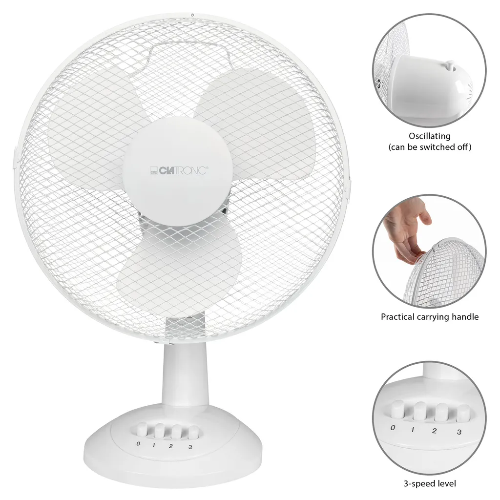 Dieser Clatronic Tischventilator VL 3602 sorgt für Abkühlung und Erfrischung an heißen Sommertagen. Durch sein einfaches, aber stilvolles Design ist er zudem eine hübsche Deko-Ergänzung für jede Inneneinrichtung. Dieser höhenverstellbare Tischventilator mit einem Durchmesser von 30 cm sorgt zuverlässig dafür, dass kühle Luft im ganzen Raum optimal verteilt wird. Mit 3 Geschwindigkeitsstufen regulieren Sie selbst den gewünschten Kühleffekt. Mit einer Oszillationsfunktion verteilt dieser Tischventilator die kühle Luft effektiver und breitflächig im Raum. Der Ventilator verfügt über einen verstellbaren Lüfterkopf und einen stabilen Standfuß. Dank des praktischen Tragegriffs kann dieser Ventilator auch leicht transportiert werden.