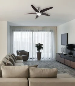 Dieser moderne Deckenventilator ist ein wahrer Eyecatcher. Durch die braunen Ventilatorflügel sowie das integrierte Beleuchtungselement werden besondere Akzente in Ihrer Innenraumausstattung gesetzt.