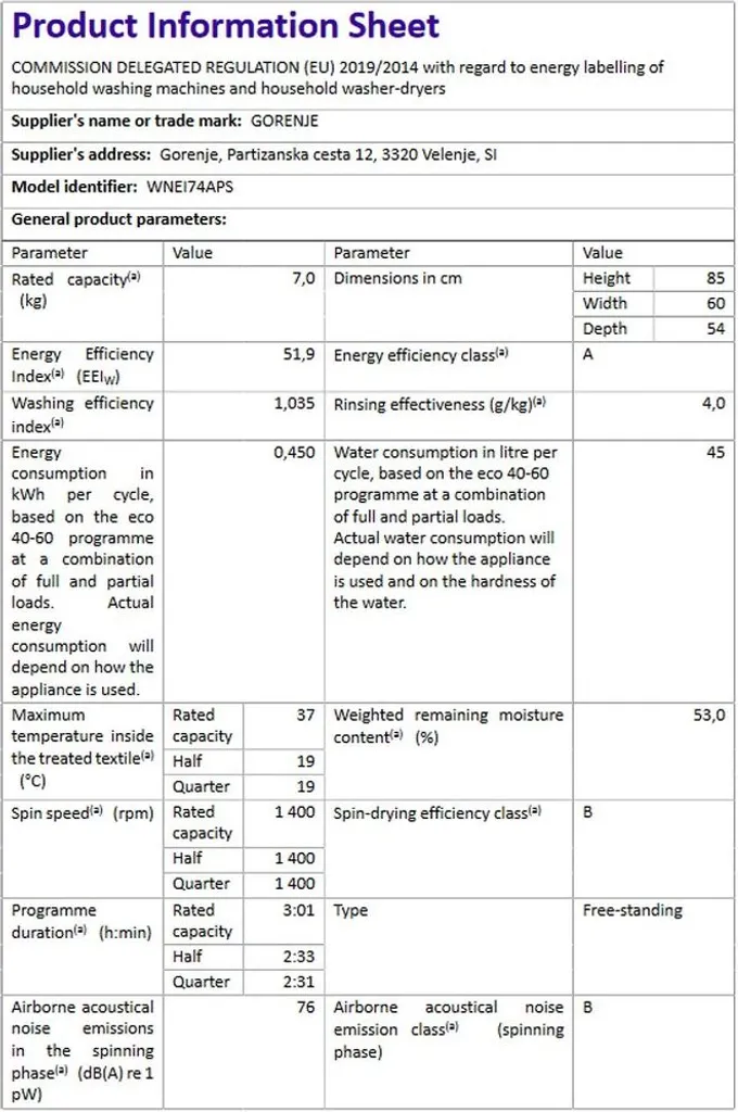 Gorenje Essential WNEI74APS – Waschmaschine – Breite: 60 cm – Tiefe: 54.5 cm – Höhe: 85 cm – Frontlader – 54 Liter – 7 kg – 1400 rpm – weiß