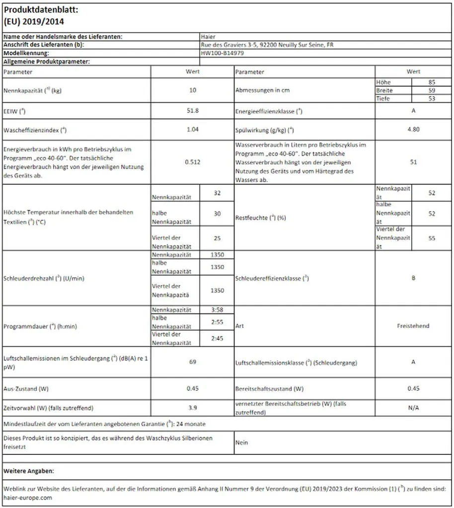 Haier HW100-B14979 Waschmaschine Frontlader 10 kg 1.351 U/Min 14 Programme (Skala A bis G)