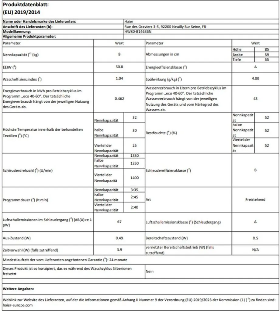 Programmdauer, eco 40-60° bei vollständiger Befüllung: 215 min