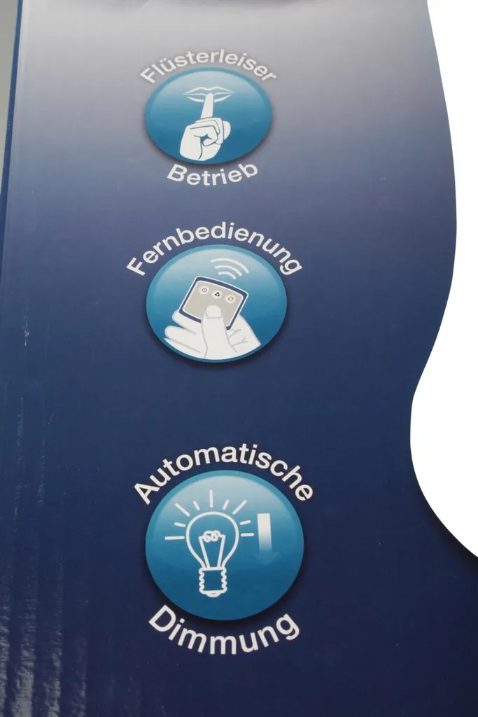 5 leise Betriebs-Stufen programmierbar 1,2,4 oder 8h einfaches Bedienfeld mit LED-Display, oszillierend Fernbedienung mit Ablagefach im Gerät, besonders einfache Reinigung Maße: 27,3 x 20,9 x 83,4 cm