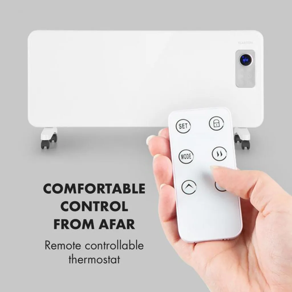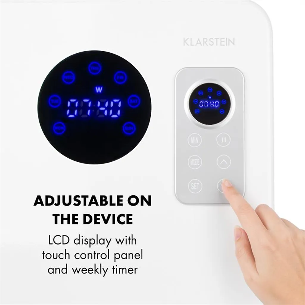 Schnelles Erhitzen: 2 Heizstufen mit 1000 oder 2000 Watt, X-Shape Heizelement: für besonders effizientes Heizen, Direkt am Gerät einstellbar: LCD-Display mit Touch-Bedienfeld und Wochentimer, Komfortable Steuerung von Weitem: per Fernbedienung kontrollierbares Thermostat, Schutzklasse IP24: problemloses Aufstellen in Badezimmern oder Feuchträumen, Flexible Aufstellung: geeignet zur Wandmontage oder als Standgerät inklusive Rollen und Montagematerial