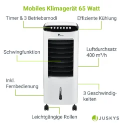 Heiße Sommertage in kühler Atmosphäre in Haus oder Wohnung verbringen? Mit dem mobilen Klimagerät 65 Watt inkl. Fernbedienung sind Sie bestens gerüstet. Die mobile Klimaanlage mit Wassertank und Eisblöcken kühlt die Luft auf angenehme Temperaturen herunter. Geschwindigkeit, Betriebsmodi, Timer und Schwingfunktion lassen sich über das Bedienfeld und die Fernbedienung kinderleicht einstellen. Zugleich benötigt der Luftkühler nur wenig Strom und ist überaus leise. Durch seine schlichte Optik fügt sich das Gerät unauffällig in Schlafzimmer, Kinderzimmer, Wohnzimmer, Küche oder Bad.