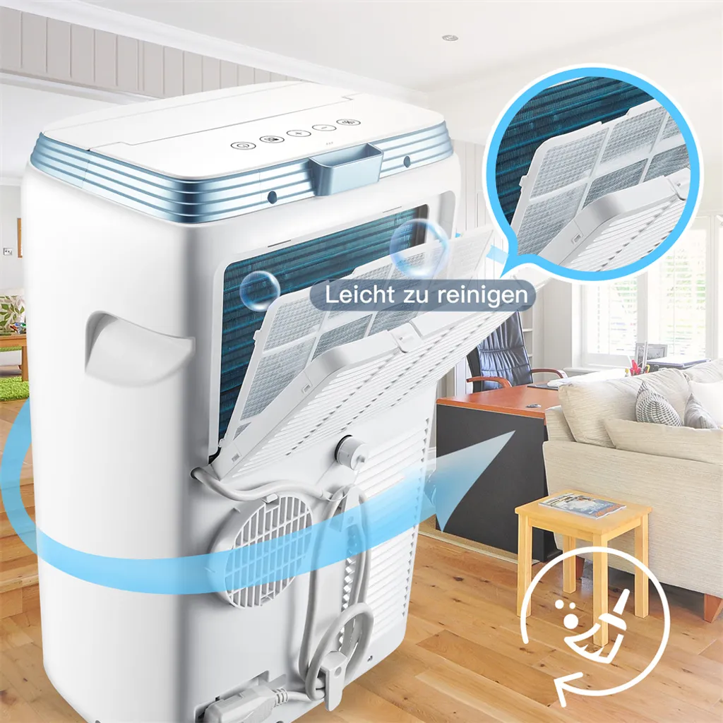 - Das Klimagerät hat ein Filtersieb, das leicht zu demontieren ist. Schalten Sie einfach den Strom aus und öffnen Sie die hintere Abdeckung, um das Filtersieb herauszunehmen. Auch die Reinigung ist sehr einfach, einfach mit Wasser abspülen. Nach der Reinigung bringt Ihnen das mobile Klimagerät wieder kühle und angenehme Luft…