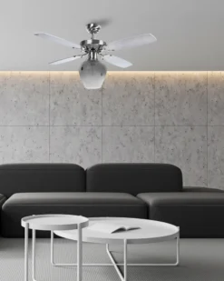Um Ihr Zuhause auch an heißen Sommertagen angenehm und kühl zu halten ist dieser hochwertige Deckenventilator im Retro-Look eine Bereicherung für Ihre vier Wände. Sein volles Potenzial entfaltet der Ventilator vor allem in kleinen bis mittelgroßen Räumen. Anschalten lässt sich dieser über die sich an der Seite befindenden Zugschalter. Die Leuchte und der Ventilator lassen sich hier bequem separat anschalten. Dank der Rücklauffunktion Alle Rotorblätter sind zudem auf einer Seite weiß und auf der anderen grau. So können Sie selbst entscheiden welche Farbkombination am besten zu Ihrer Möblierung passt. Der zeitlose Glasschirm mit grauem Farbverlauf passt zu fast jeder Einrichtung und lässt den Ventilator zu einem Blickfänger werden.
