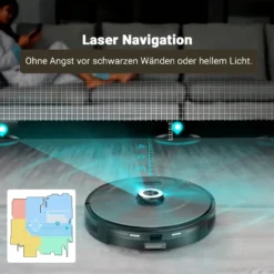 - Mittels 360° Laser Technologie werden Ihre Räume und mehrere Etagen gescannt. Dadurch haben Sie eine Kontrolle in der App und können Bereiche automatisch einteilen.