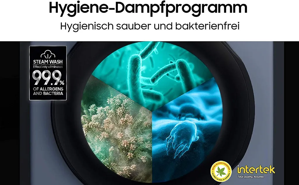 Das Hygiene-Dampfprogramm bietet hygienische Sauberkeit für deine Wäsche bis in die letzte Faser, dank zusätzlicher Tiefenbehandlung mit Dampf. Während des integrierten Dampfzyklus durchdringt Dampf vom Trommelboden aus deine Wäsche und verbessert die Reinigungsqualität. Hierdurch werden Bakterien, Allergene und eingetrockneter Schmutz entfernt.