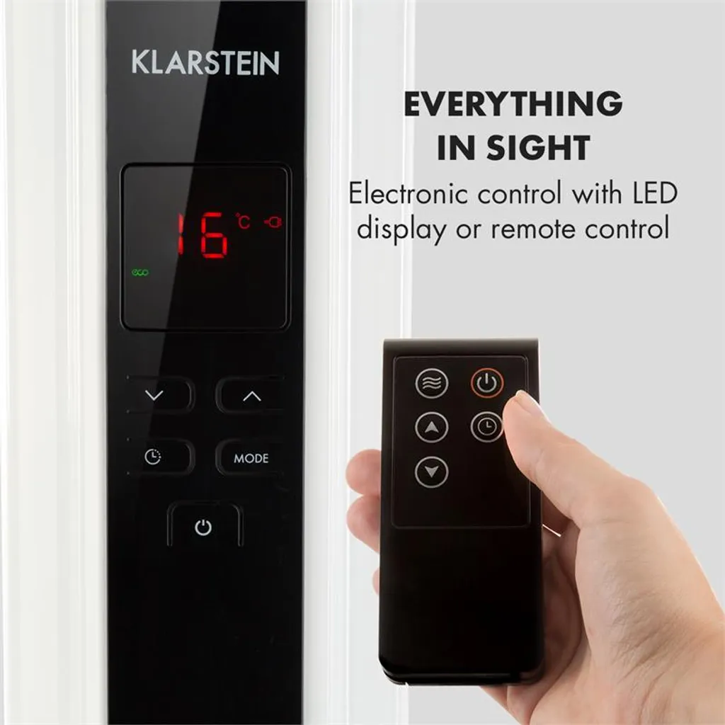 Heizleistung nach Wunsch: schnelles Aufheizen im Temperaturbereich von 5 bis 35 °C, Alles im Blick: elektronische Kontrolle mit LED Display oder per Fernbedienung, MX-ThermalFin Design: bis zu 65 % mehr Leistung durch spezielle Rippenform für effektive Wärme, Kraftvolles Heizen: mit 2500 Watt Leistung, 3 Heizstufen und ECO-Modus, Sicherheit im Betrieb: besondere Rippenstruktur und Abdeckung für kühlere Oberfläche, Entspannt schlafen: mit 24-Stunden-Timer für On/Off-Funktion, 2-Layer Heating System: mit Double U-Shape Heizrohr, Kompakt und mobil: geringes Gewicht und Bodenrollen zum leichten Transport, Optimale Wärmeverteilung: durch vergrößerte Heizfläche mit 12 Heizrippen