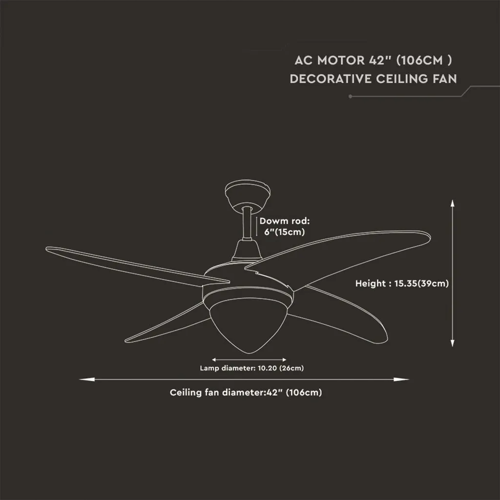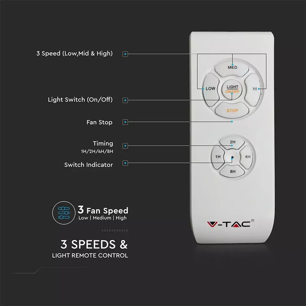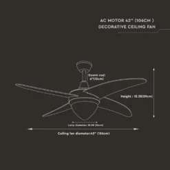 Dekorativer Deckenventilator mit HF-Steuerung, Vorwärts- und Rückwärtsfunktion sowie eingebautem 15W 3IN1 CCT LED-Licht. Konzipiert zur Anwendung in Restaurants, Wohnzimmer, Schlafzimmer und Büros und mehr. Features: – 4 MDF-Klingen – Leistungsstarker Motor – 3 Geschwindigkeiten – Timer Funktion – Hinweis: Geeignet und empfohlen für eine maximale tägliche Nutzung von 10-12 Stunden. – Individuelles Einstellen und von Lichtfarben per Fernbedienung Technische Daten: – Ventilator – Betriebsspannung: 200…240 V, 50 Hz – Leistung: max. 60 W – Motor Gewicht: 2,3 kg – Umdrehungen pro Minute: max. 220 U / min – Klingenwinkel:13 ° – Schutzart: IP20 – Maße: 1060x 390 mm – Farbe: silber – Leuchte: – Lichtfarbe:3000/ 4000/ 6400 K (warmweiß…kaltweiß) – Lichtstrom: 1500 lm – Farbwiedergabeindex (CRI): >80 Ra – Zündzeit: < 0,5 s – Quecksilbergehalt: 0,0 mg Lieferumfang: – LED-Deckenventilator VT-6043 – Fernbedienung – Befestigungsmaterial – Anleitung