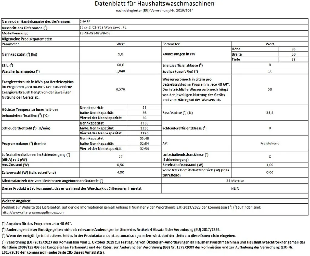 - Geräuscheniveau beim Schleudern in dB(A): 77