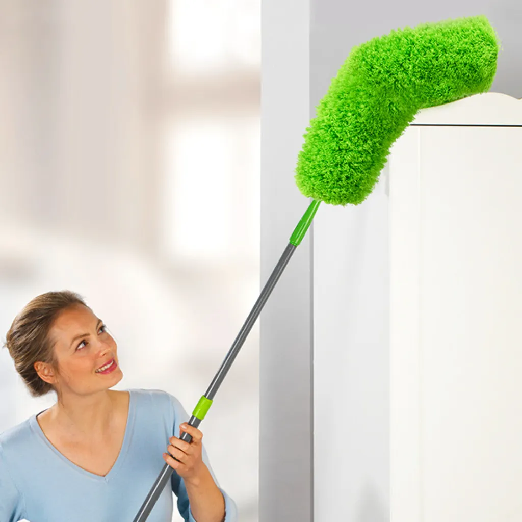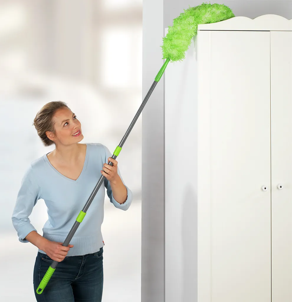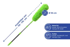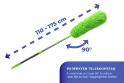 Der Wedel verfügt über Mikrofaser, die sich statisch aufladen und den Staub magisch anziehen. So wird der gesamte Schmutz nicht mehr aufgewirbelt. Auch schmale Zwischenräume und Nischen können mit dem Teleskop-Staubwedel endlich gründlich gereinigt werden. Sie können das Staubwunder für Einsatzhöhen bis 3,80m verwenden.
